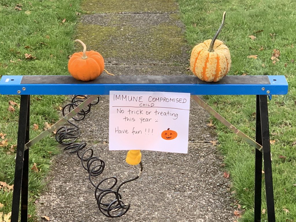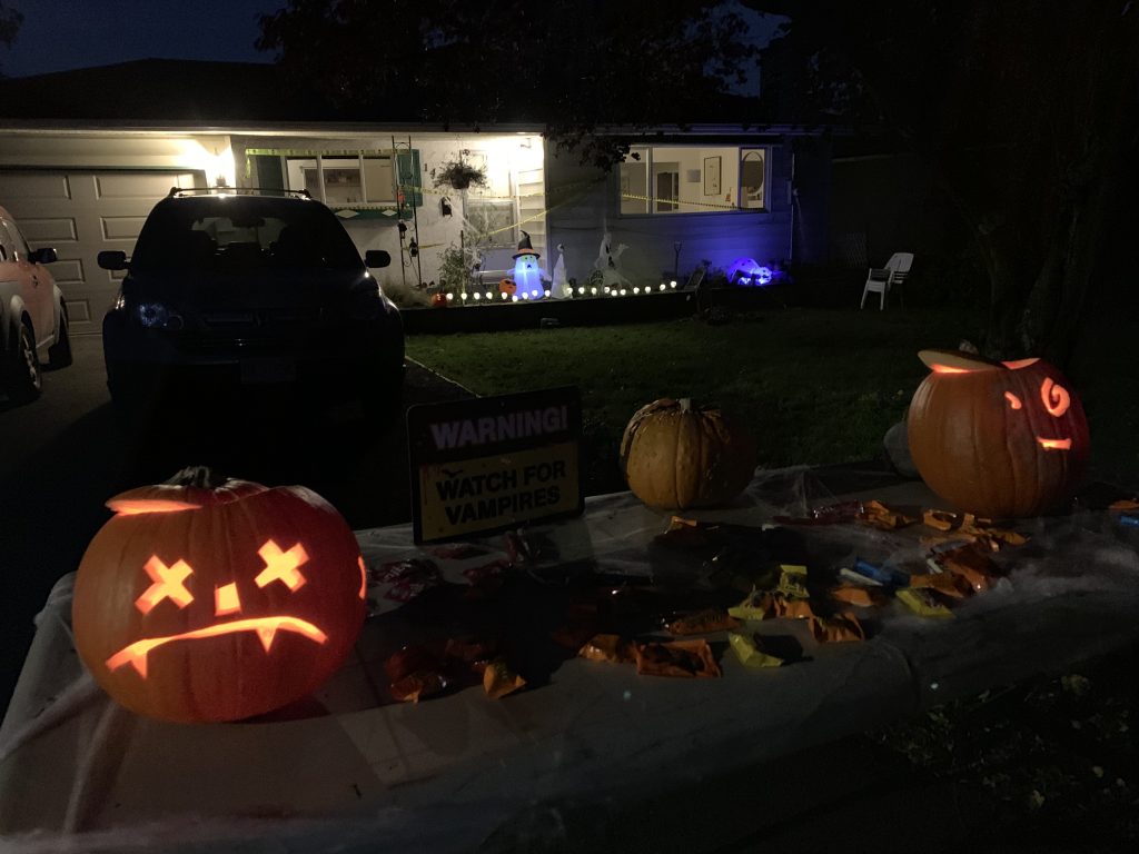 Some houses had signs like this outside. It was a good reminder that a lot of people were choosing not to recognize Halloween this year, at least not in the same way they have other years. Vancouver Island has had remarkably low numbers of Covid cases. Some parents felt it was safe enough to be out and were navigating their kids through all of these social distancing measures. It must have been stressful.