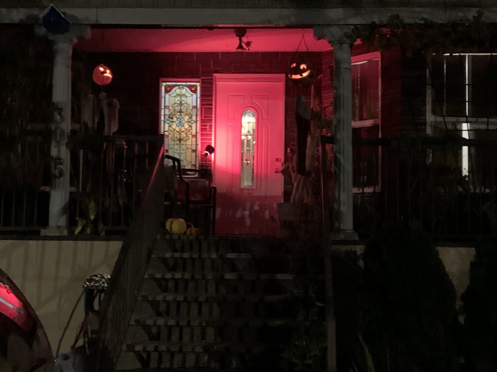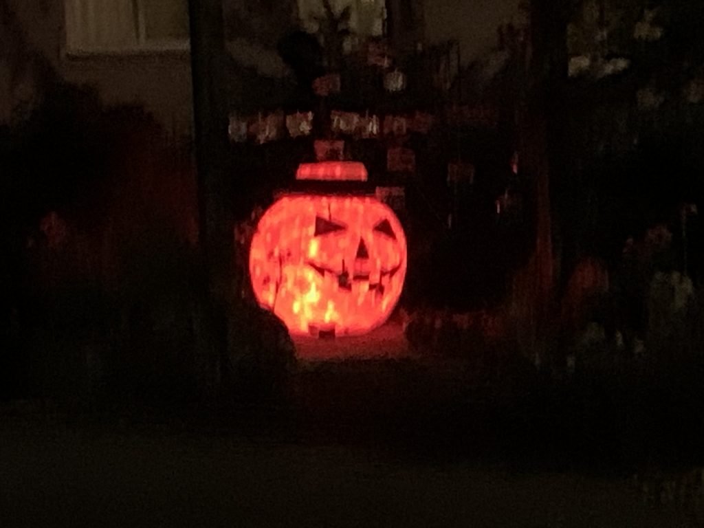 I was looking forward to Halloween this year. Being the end of the month, I only had 7 km left to make up my 100 km-a-month biking goal. Staying active has been good for me, though it is hard to make my goal some months with my nerve damage, and everything that is affected by that. But I knew tonight would be different than other month ends due to Halloween. If I timed it right, I’d probably get to see some Halloween displays, which to me are works of art. My greatest regret is that I didn’t bring my camera. Just my phone.