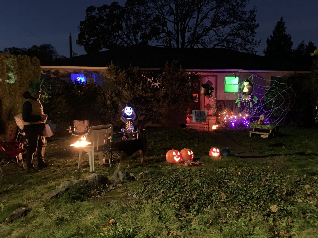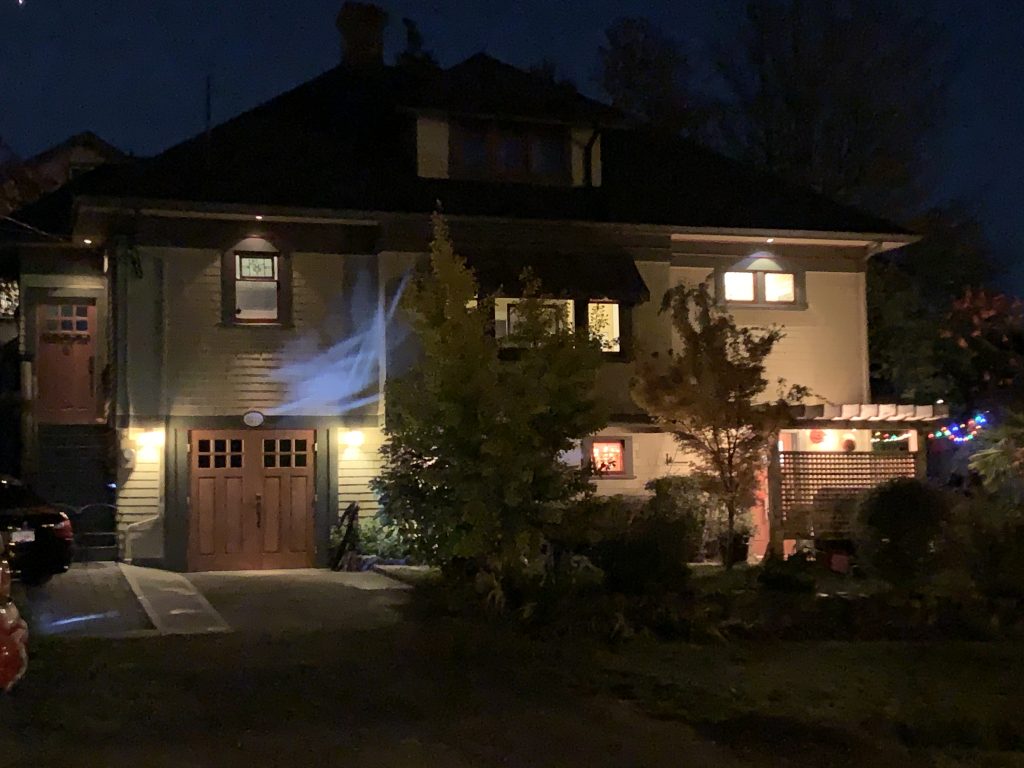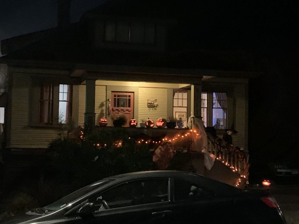 This car port was amazing. I had just passed what looked like three witches sitting around a cauldron in a dark front yard. Actual people in costume. I think. I felt sort of awkward by this point, ripping up and down the street on my bike, zigzagging around kids and parents, just to take photos on my phone. Again, if I had my camera, I could have taken better photos. I might have even peddled to some of those “Best Haunted Houses” in Victoria I’d seen on a map earlier this week.
