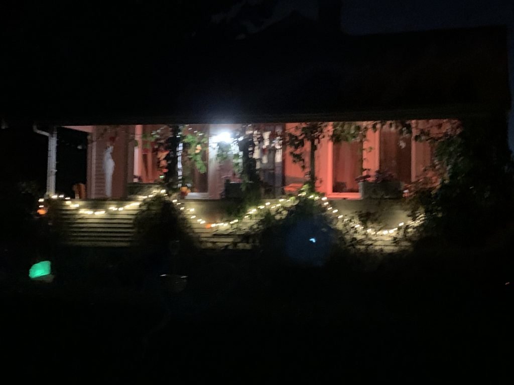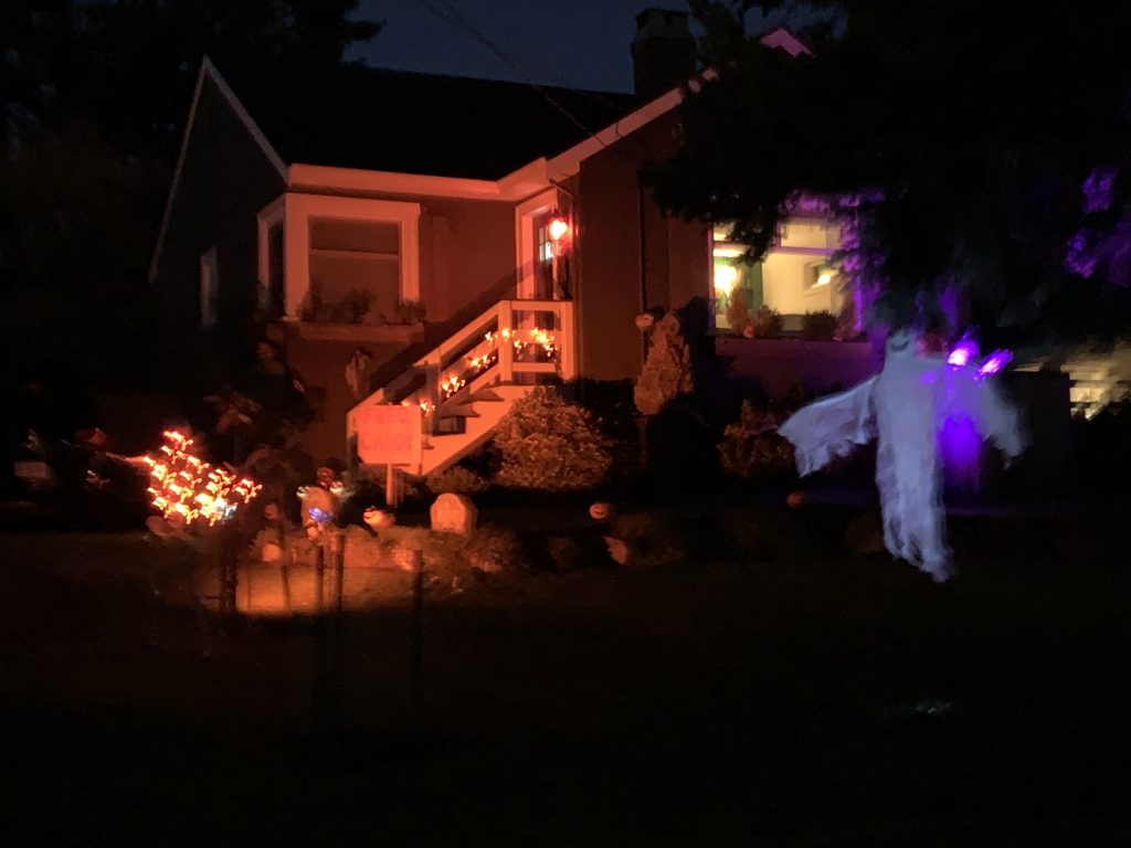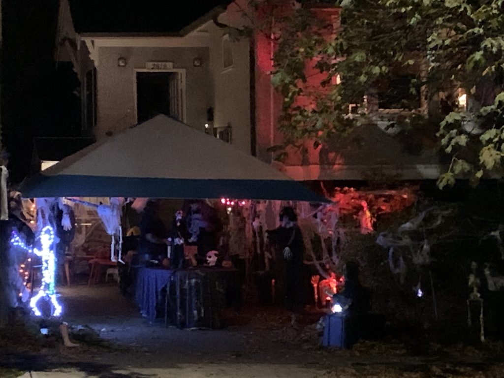 This house wasn’t overly decorated, but I liked the jack-o-lanterns and the ghost. Around this point, a woman nearby was excited and saying loudly to everyone that there was an owl in a nearby tree. I sort of listened for a couple of minutes before asking her directly if she was serious. She said she was and that she had seen it move.