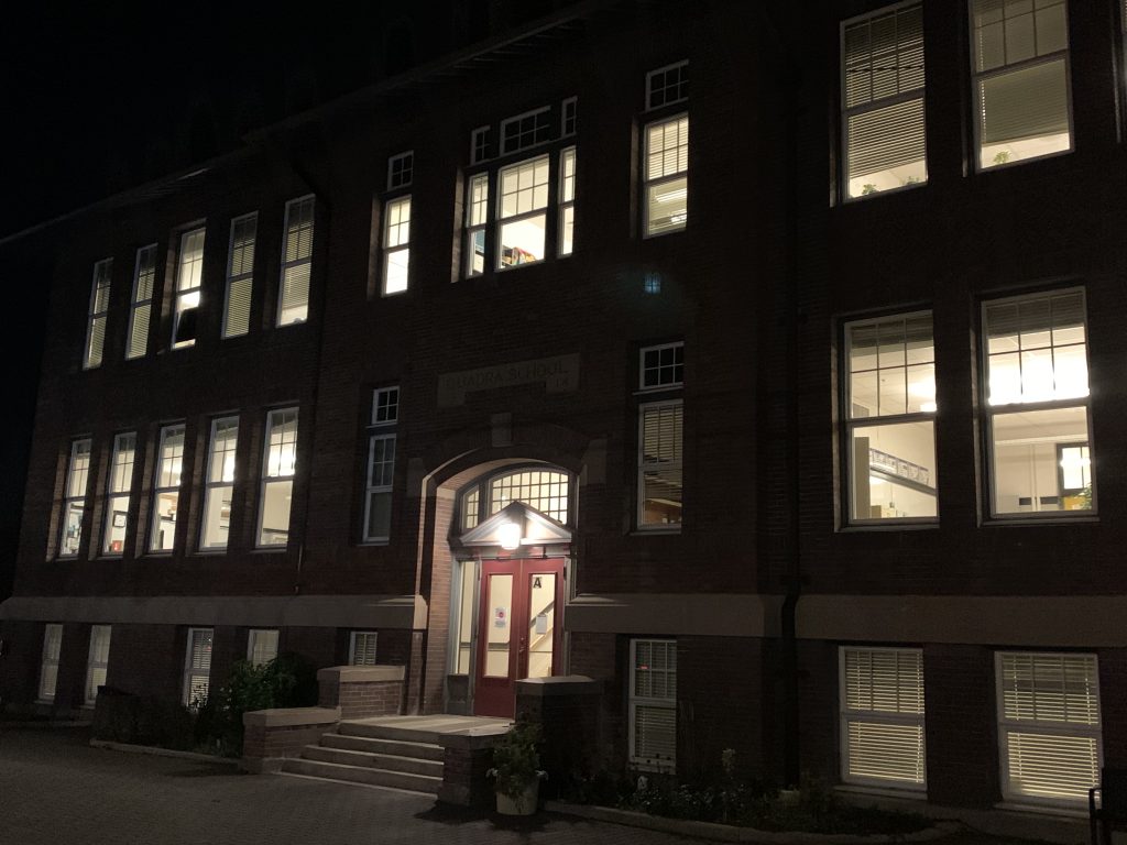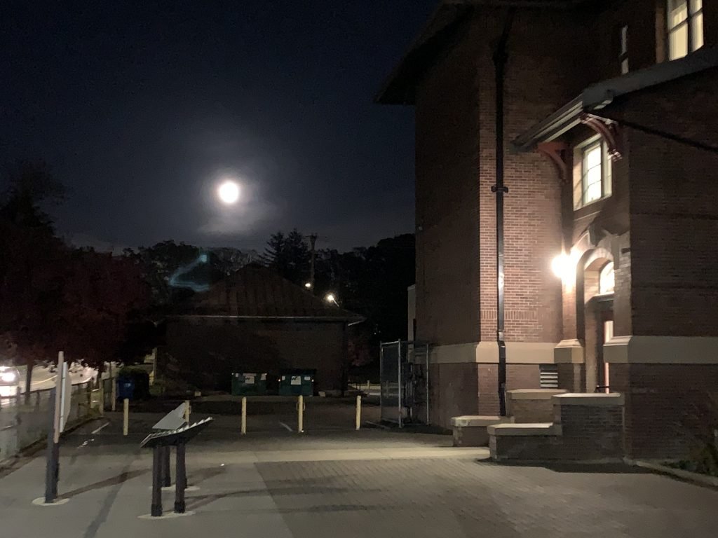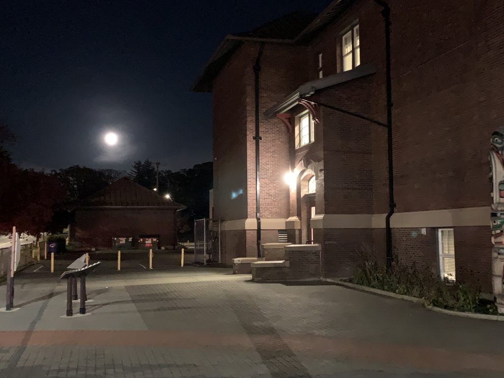 This was the first photo I took at the side of Quadra School. I wanted to get the full moon in the background. I’m not sure what the blue light is, other than probably a lens reflection inside my camera. I don’t really see anything similar in any of the other photos though, except possibly in the blurry one.