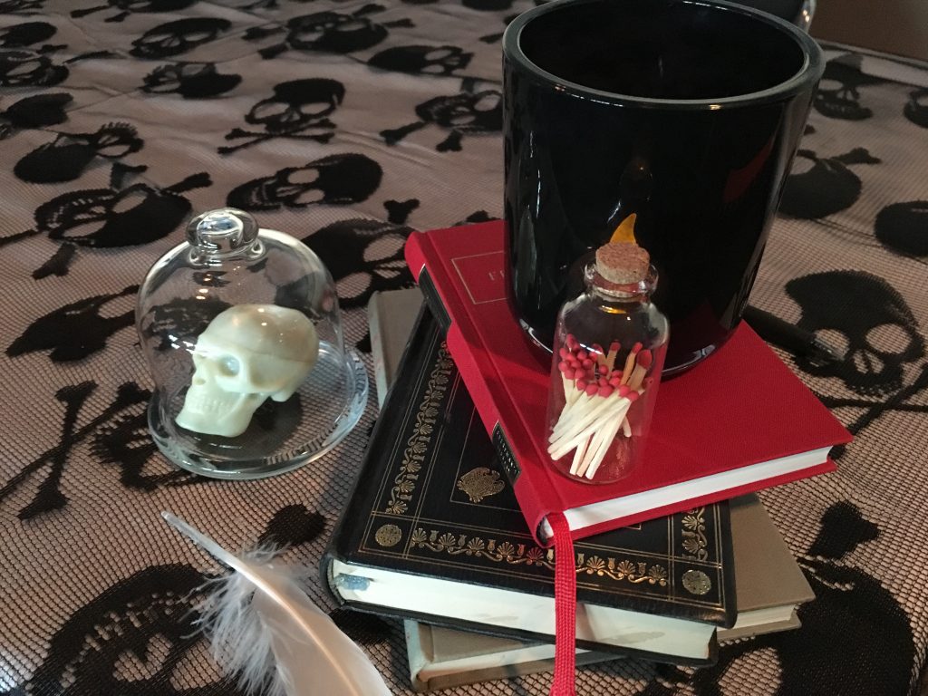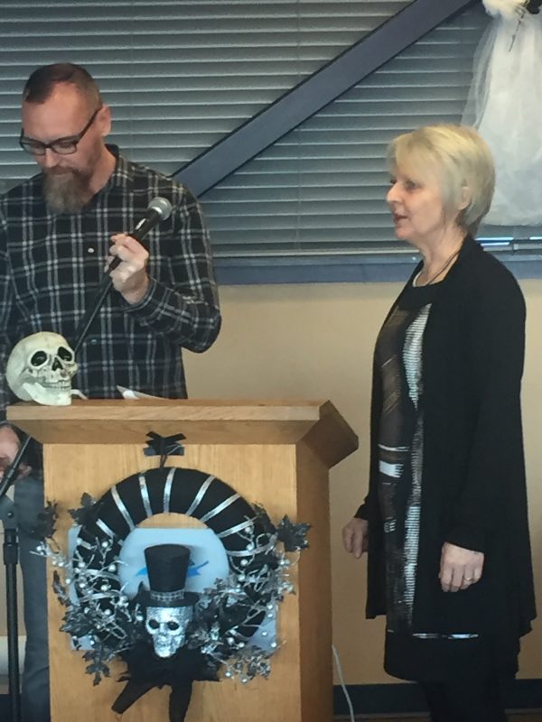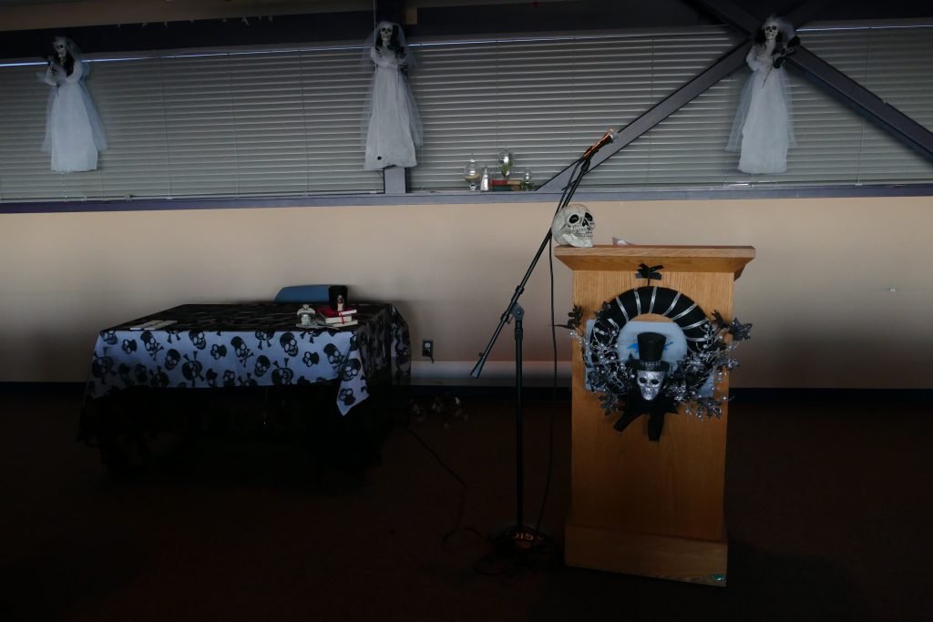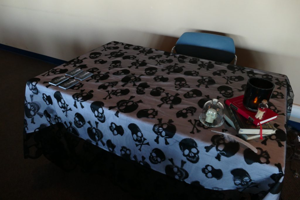 Here’s the front of the room before the presentation. I wanted the decorations to represent the book. I carefully chose items that were not tacky or overly-Halloweenish. Sarah and Cheryl Folland (Arts Editor for The Navigator) gave me direction how to lay out the room. Olivia (Cheryl’s partner) and my sister Sunni did a lot of work as well.