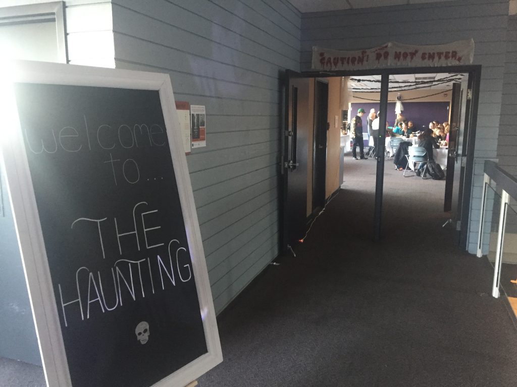 There was a chalkboard sign in the entry hallway. This was designed by my friend Sarah Packwood who also took my author image for the book. You can also see a ghost on the wall from a projector as well. These ghosts showed up great after it got dark, but not sure if anyone took a photograph of them later in the night.