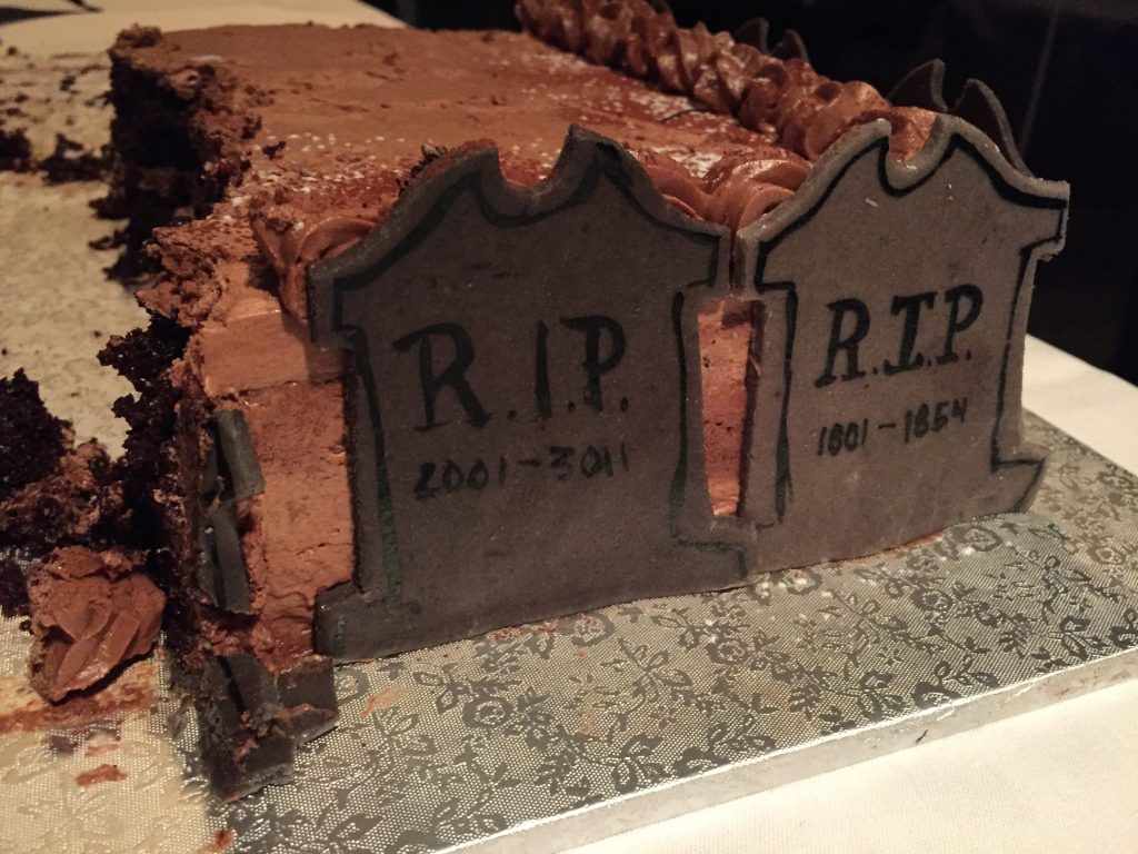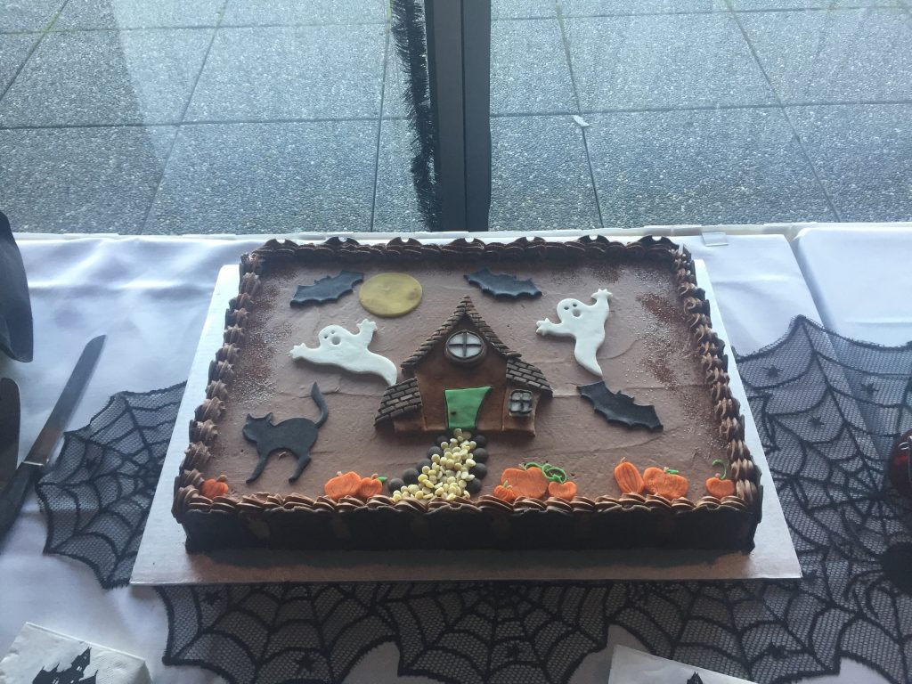 This is the cake and coffee table. We didn’t get a photo of the pizza table. That one had different napkins that said “Boo” on them. There was also a candy bowl with an animated zombie hand filled with treats. The candies were on the tables as well.