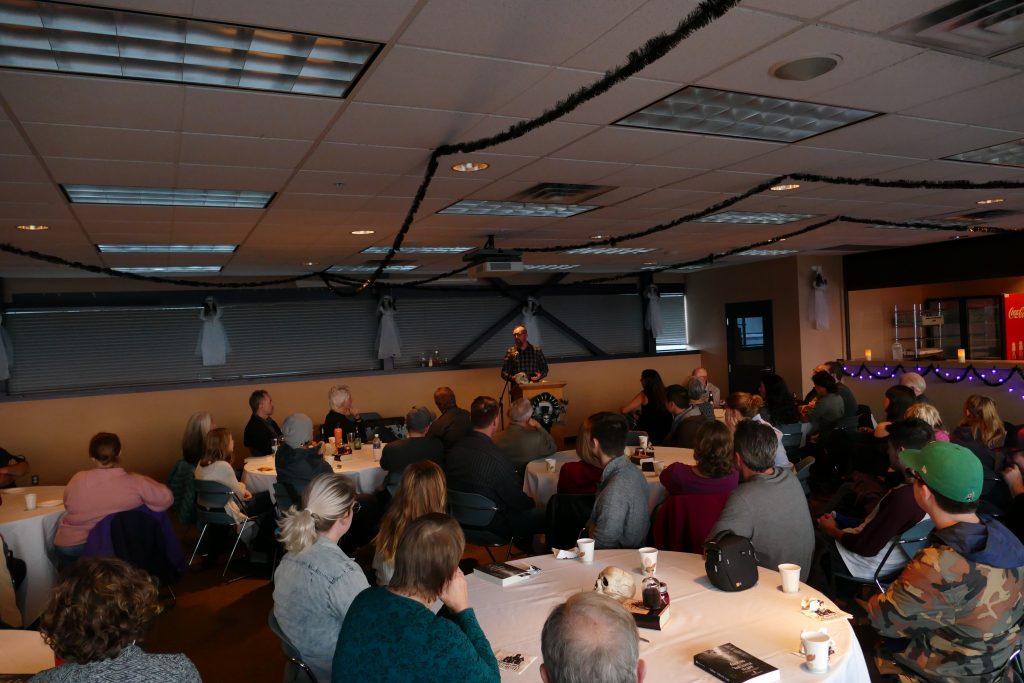 Here is another image of me doing my readings and giving my speech (other than the top image of this post). I read short excerpts from: “Keeha Beach,” “Ghosts and Black Magic: Stories From Chief James Swan of Ahousaht,” “Coal Barons and Castles” (video), “Victoria’s Graveyards,” and of course “Vancouver Island University’s Theatre Ghost.” In the background you can see the bar, with a string of ghost lights.