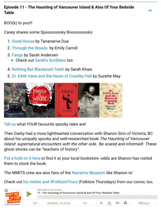 Meet Me in the Stacks is Vancouver Island Regional Library’s podcast. Each episode is unique, but almost always has a book recommendation segment. I’ve added Casey’s Halloween recommendations to my reading list for next year.