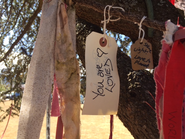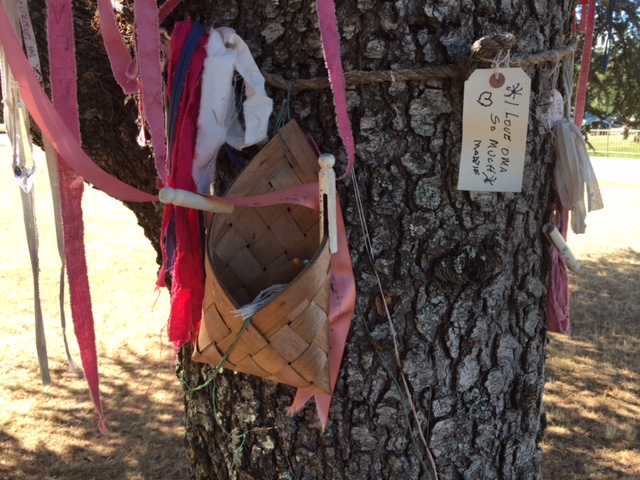 I was taking a stroll outside of the old Ladysmith Hospital when a flutter of colour caught my attention. The building hasn’t been used as a hospital for a very long time and is now a health clinic, which was why I was there. The weather was beautiful and I had a break between doctor appointments, so I had decided to take a walk around the property. My curiosity pulled me closer. Beneath the canopy of the tree, I found an old wooden sign, which had been invisible from a distance. On the other side was a basket-like envelope with some supplies in it.