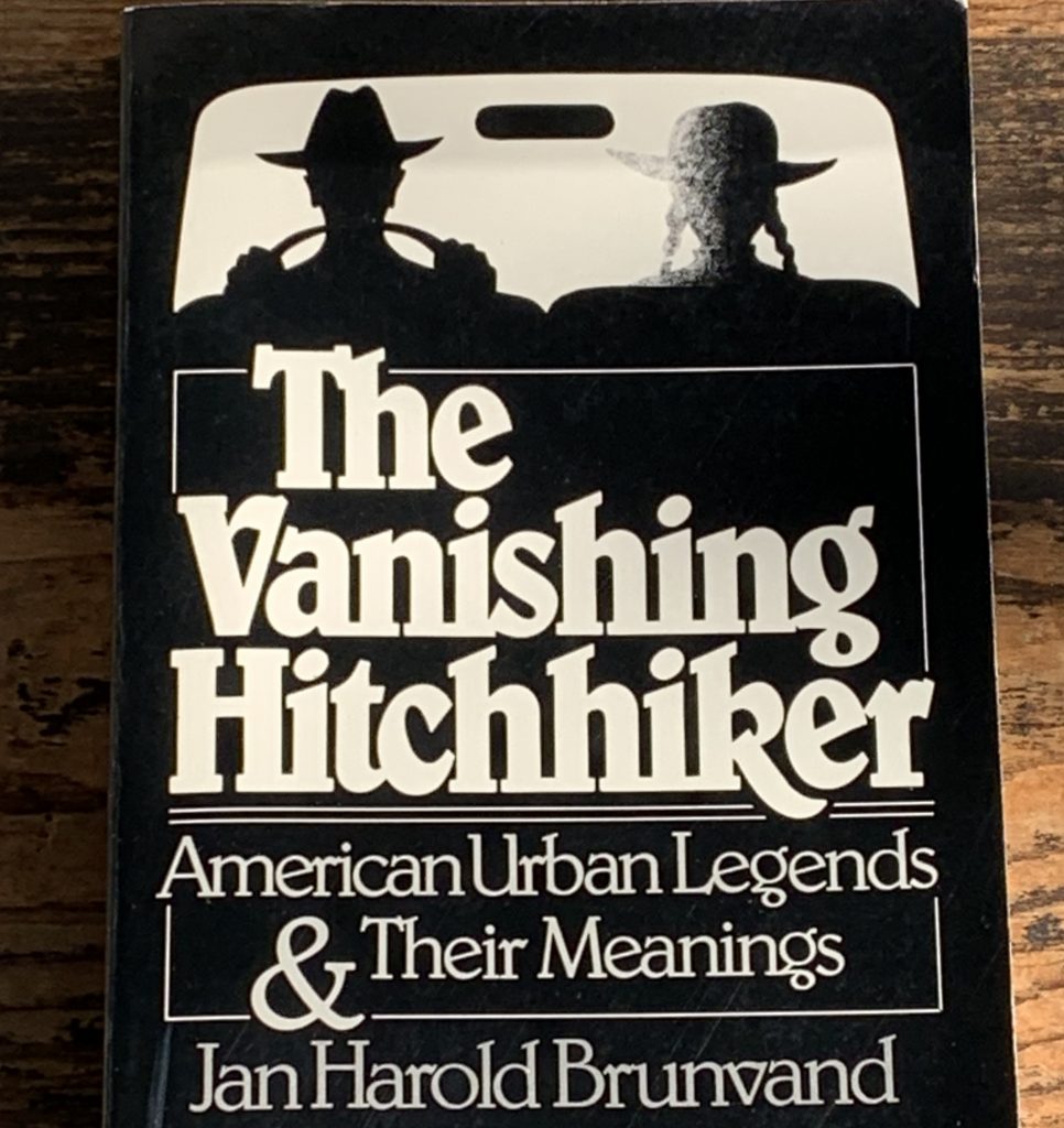 The Vanishing Hitchhiker by Jan Harold Brunvand defines an Urban Legend as a “realistic story concerning recent events (or alleged events) with an ironic or supernatural twist.” The teller of the story believes the legend is true, and that the events actually happened to someone just out of reach–to a friend of a friend, for example, or to somebody’s relative.